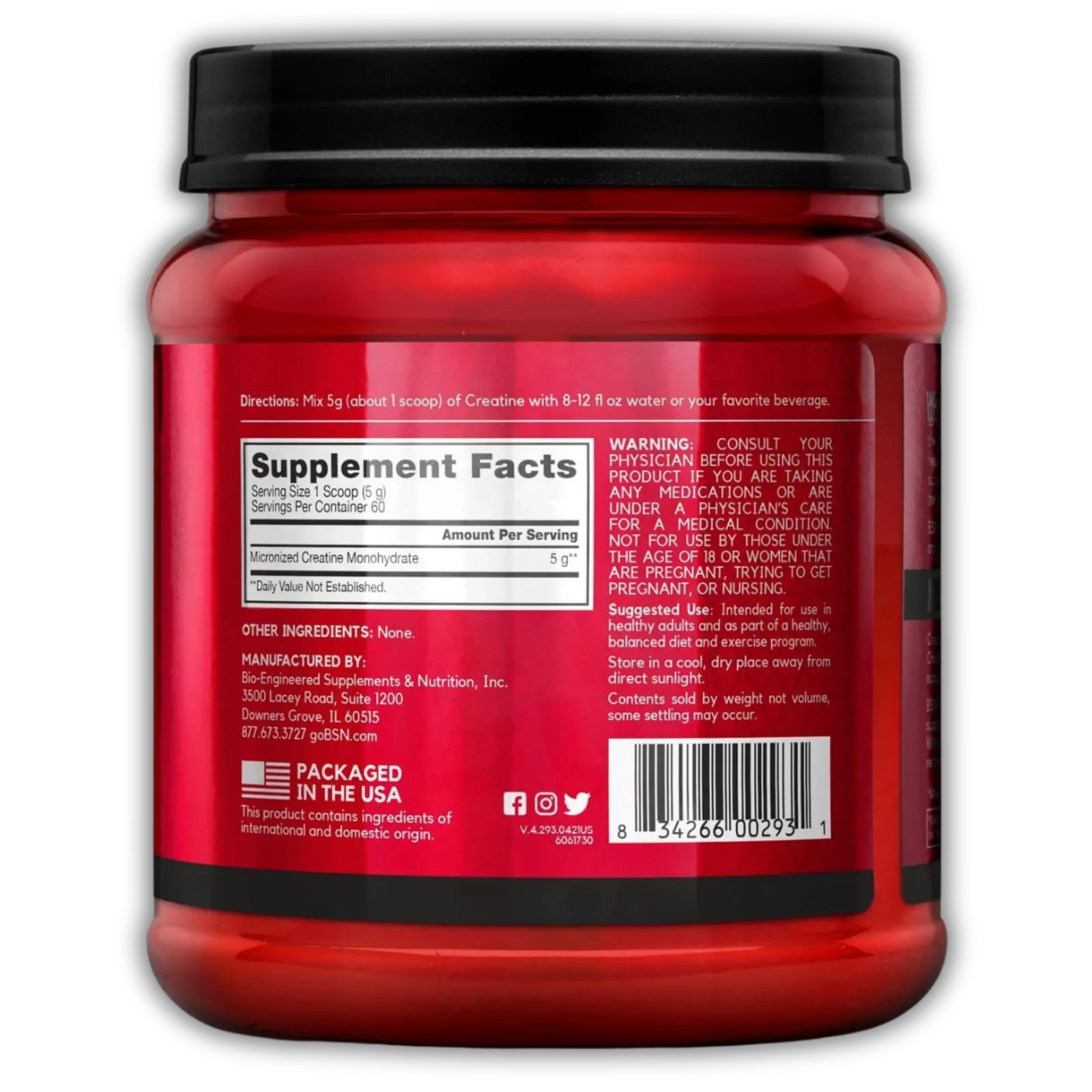 BSN Creatine Monohydrate Micronized 309 g es creatina monohidrato 100% pura y micronizada, formulada para aumentar la fuerza, mejorar el rendimiento físico y potenciar el desarrollo muscular.