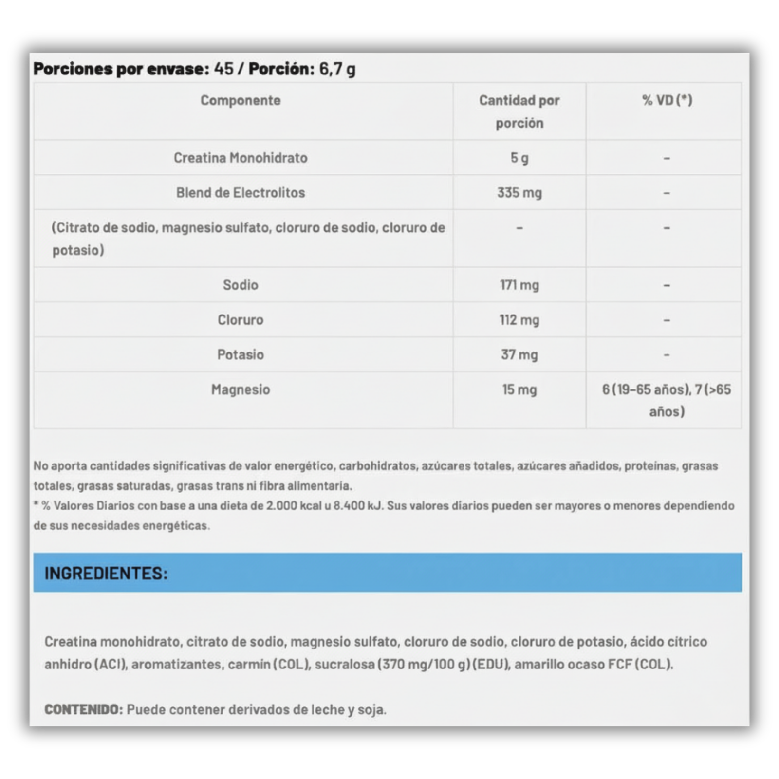 Aporta 5 g de creatina monohidrato micronizada por porción junto con un blend balanceado de electrolitos (sodio, potasio, magnesio y cloruros), que ayuda a sostener la función muscular y evitar calambres, fatiga y falta de sales.